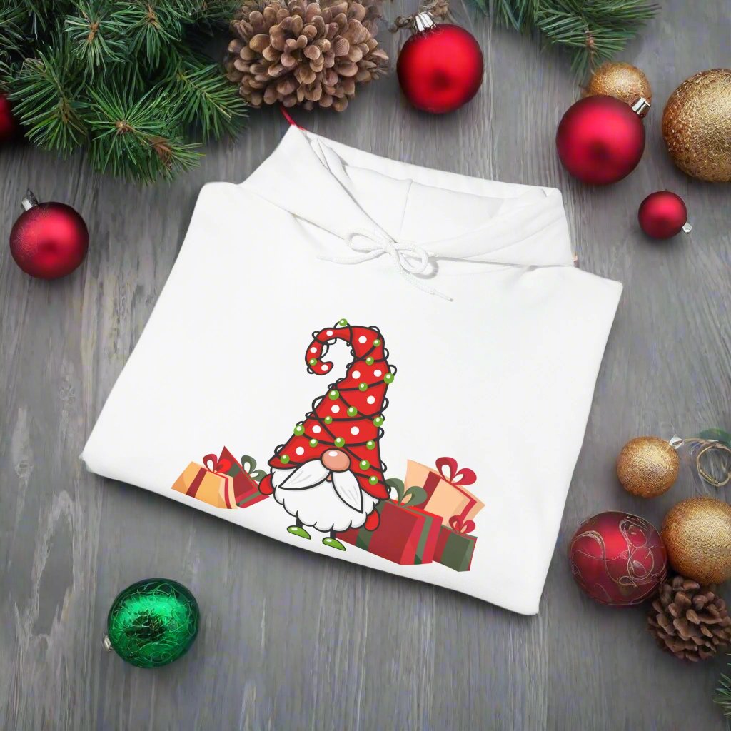 Stay cozy and warm in this Hooded Sweatshirt featuring the Merry Christmas Gnome Gang "Brightlzel Brewzer"