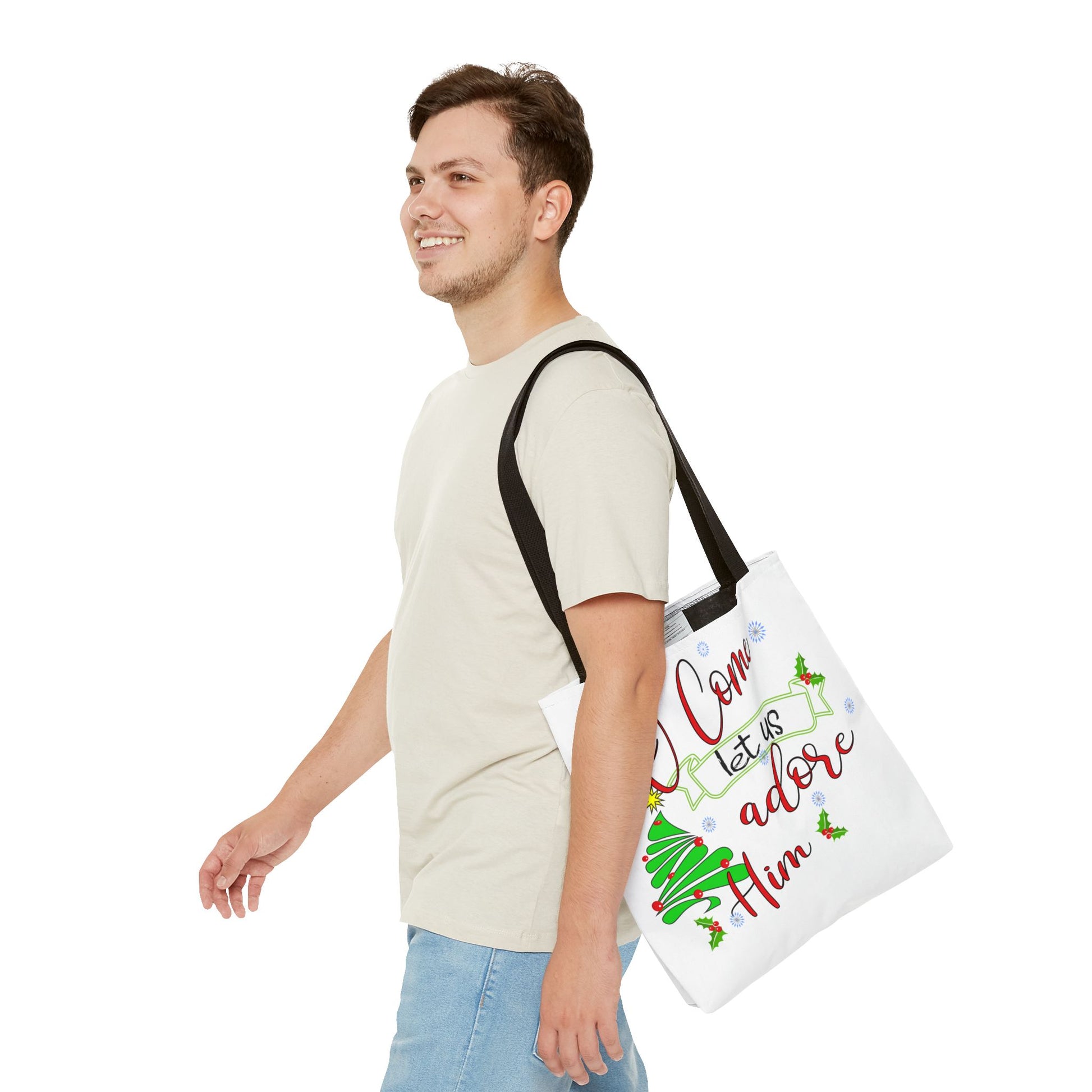 'Tis the season for festive and cozy vibes with this "Oh Come Let Us Adore Him" tote bag! Made of 100% polyester, it's durable enough for all your holiday shopping needs. Plus, the reinforced handles and boxed corners add extra room for all those gifts.